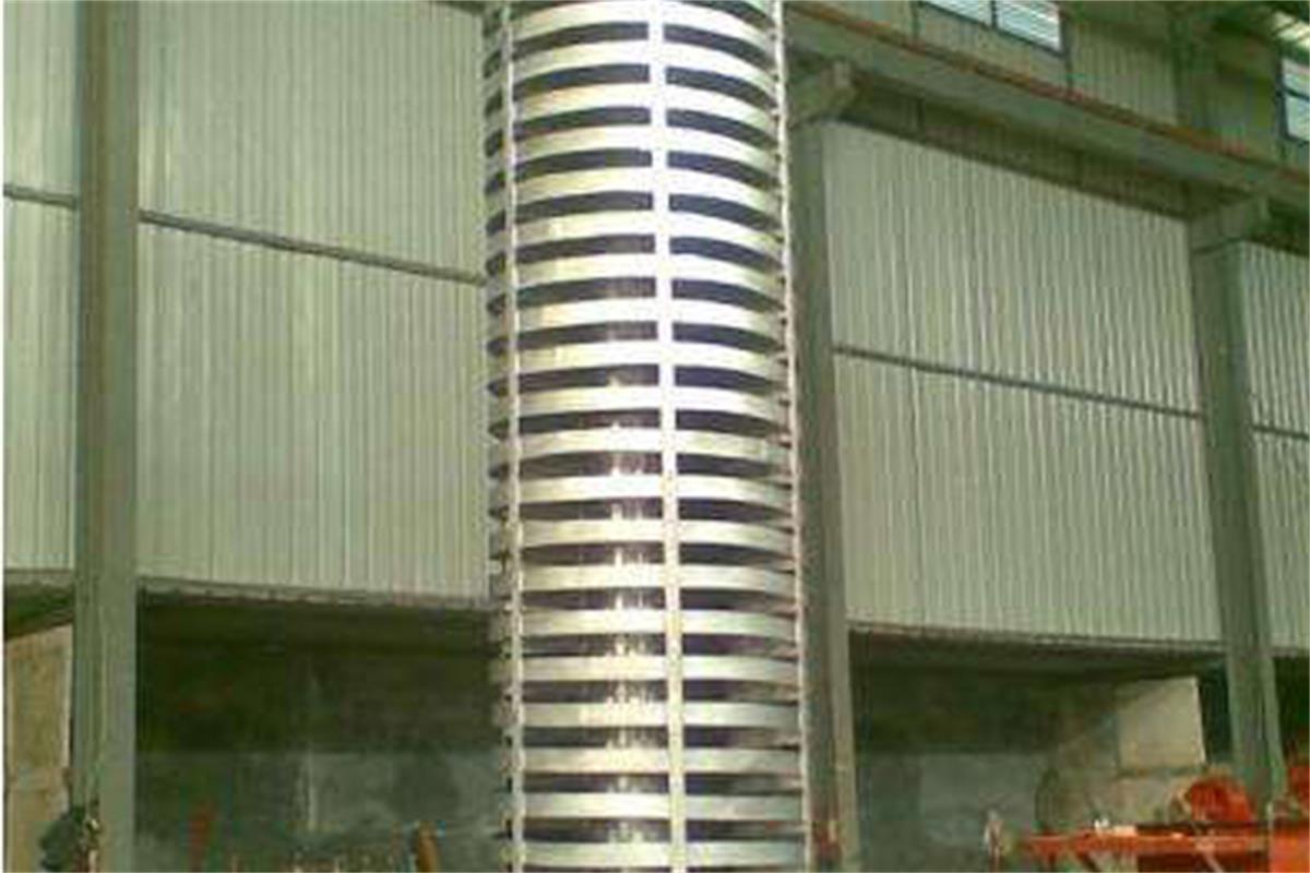 垂直振動(dòng)輸送機(jī)是通過(guò)激振器強(qiáng)迫振動(dòng),使輸送塔作沿垂直方向的直線振動(dòng)和繞鉛垂中心軸的扭動(dòng)振動(dòng),兩個(gè)振動(dòng)的合成,使物料朝 螺旋運(yùn)動(dòng)的方向斜拋,形成了物料沿螺旋槽向上的輸送過(guò)程。垂直振動(dòng)輸送機(jī)是由提升槽、振動(dòng)電機(jī)、減振系統(tǒng)和底座等組成。垂直振動(dòng)輸送機(jī)分開槽式、封閉式兩種結(jié)構(gòu)。